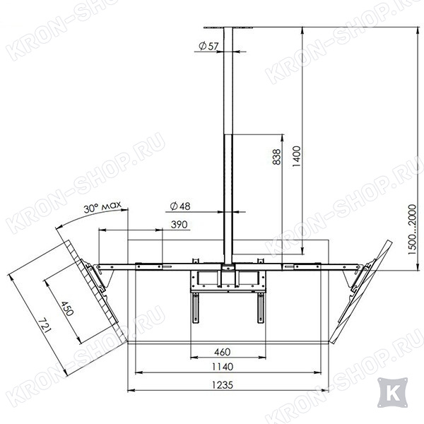 Кронштейн предназначен для монтажа телевизоров к потолку. Высота регулируется от 1500 до 2000 мм. Вы сможете подобрать наиболее удобное положение панелей в зависимости от размеров помещения и величины аудитории.
