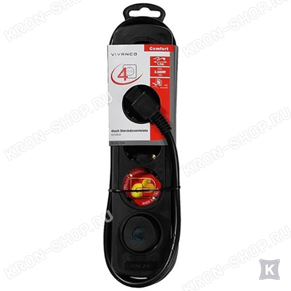 Компания Vivanco выпустила серию удлинителей Comfort- отличного качества, в которую входят устройства с 4 и 6 розетками. Эта модель имеет 4 электророзетки и выполнена в универсальном и стильном черном цвете, который будет прекрасно подходить к любому оформлению помещения.