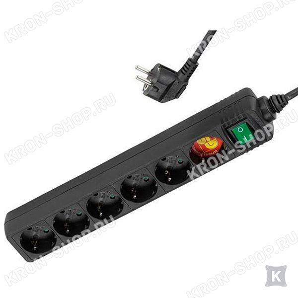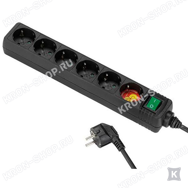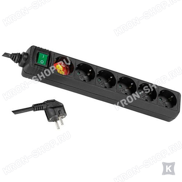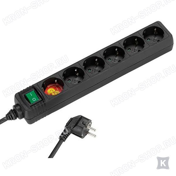 Электрический удлинитель с заземлением. 6 розеток, 1,4 метра, черный цвет.