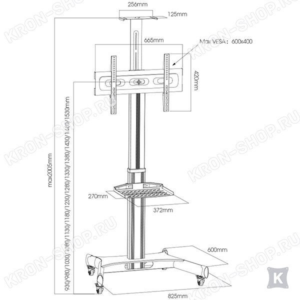 Мобильная стойка для телевизора или монитора с диагональю от 60 дюймов и выдерживающая нагрузку 136 кг.