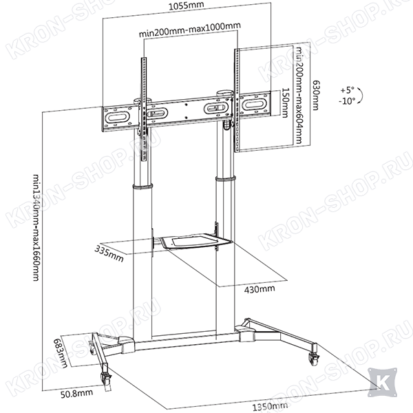 Дополнительная регулировка положения телевизора по высоте от 1340 до 1660 мм. Регулируемая по высоте полка. В конструкции стойки предусмотрены скрытые кабель-каналы.