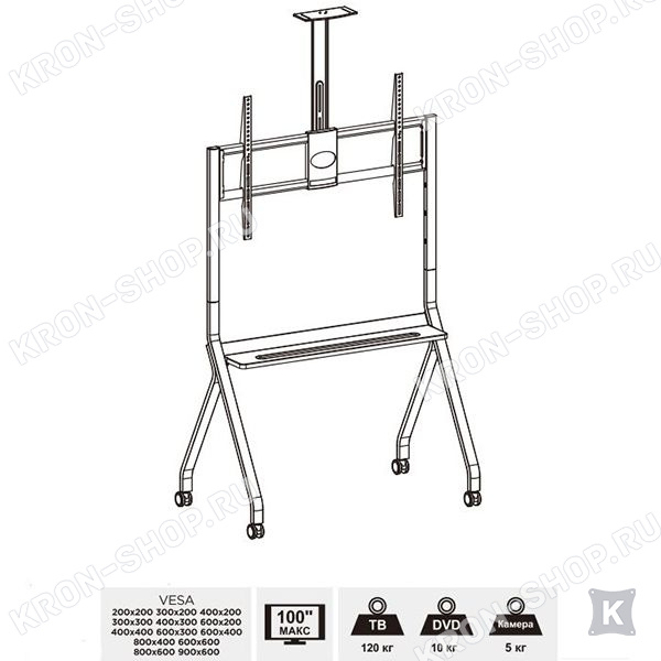 Максимальная нагрузка 120 кг. Максимальный размер телевизора 100 дюймов. Максимальная нагрузка на полку: 10 кг.