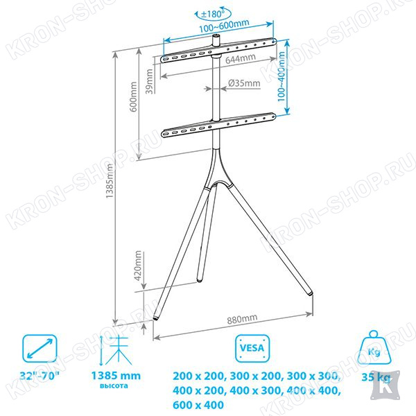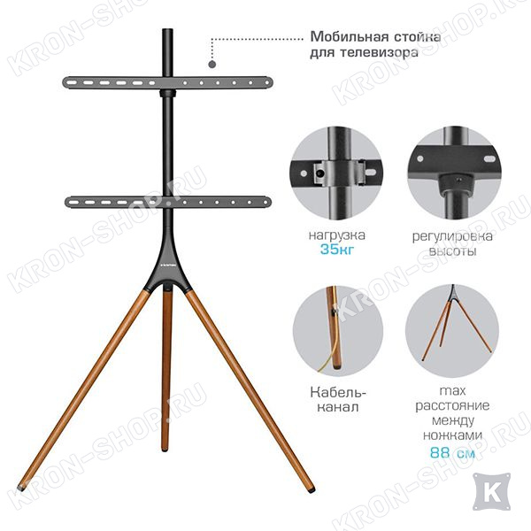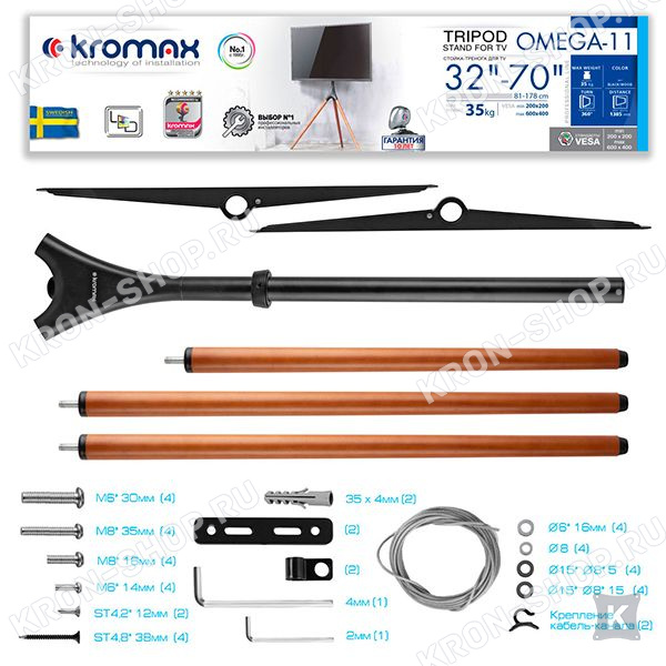 Стойка Kromax OMEGA-11 предназначена для большинства современных ЖК, плазменных и LED-телевизоров и панелей телевизоров и сенсорных панелей. Она подходит для телевизоров любых производителей, среди которых SAMSUNG, LG, Xiaomi. Предусмотренная диагональ ТВ – от 32 до 70 дюймов, максимальный вес – 35 кг.