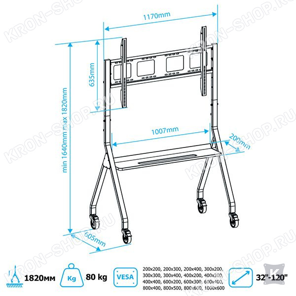 Мобильная стойка для телевизора или монитора с диагональю от 70 до 110 дюймов и весом до 120 кг.