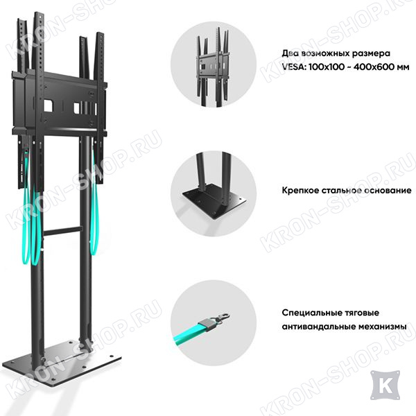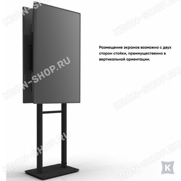 Стойка рассчитана на размещение двух экранов диагональю от 40 до 70 дюймов с каждой стороны. Максимальный выдерживаемый вес каждого экрана составляет 45 кг. Стандарт VESA: 100х100-400х600 мм.