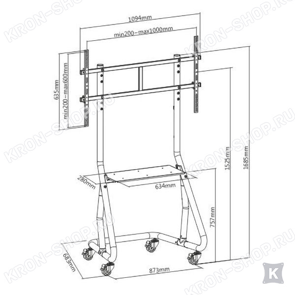 Мобильный стенд Ultramounts UM298B снабжен маневренными колесиками для удобного перемещения, которые имеют фиксатор.