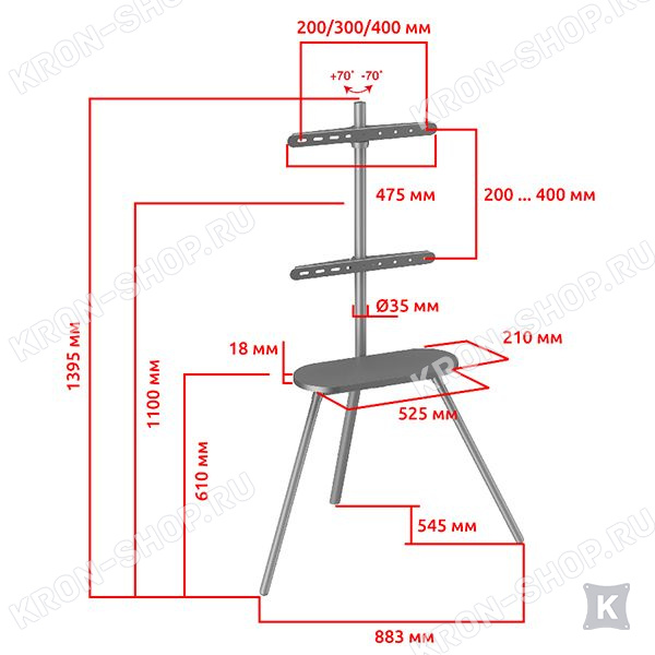 Максимальная нагрузка на стойку 40 кг. Наличие полки (максимальная нагрузка 15 кг) и кабель-канала.