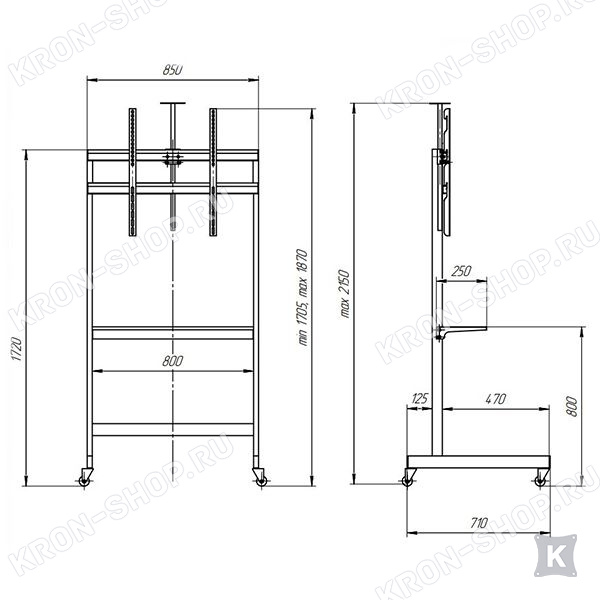 Максимальная нагрузка 100 кг. Максимальный размер телевизора 80 дюймов. Регулируемая по высоте полка для размещения аксессуаров, необходимых при проведении презентации. Полка для видеокамеры в комплекте.