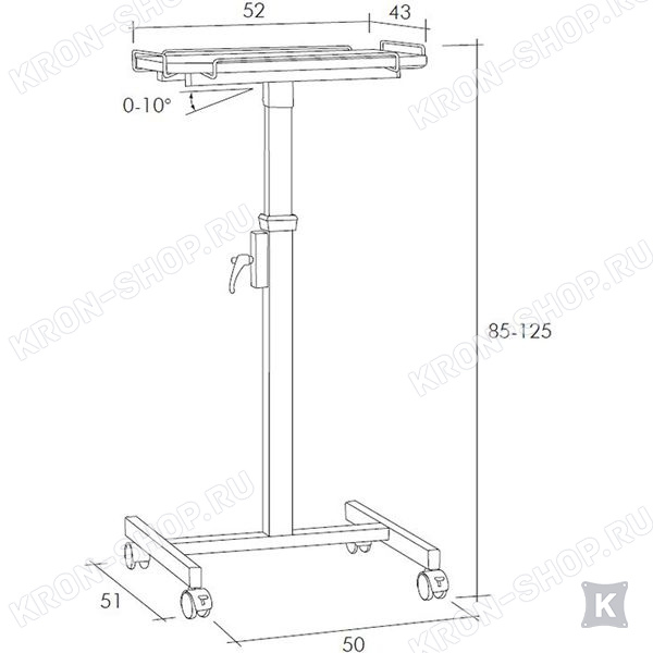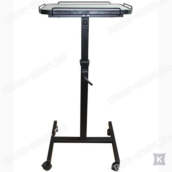 Полка регулируется по высоте и обладает возможностью наклона, делая проецирование более гибким. Благодаря этой функции, можно выбрать необходимый угол наклона исходя из расположения экрана. Дополнительное ограждение на полке защищает проектор от падения, придавая всей конструкции большую надежность. Четыре ролика с покрытием из высокопрочного каучука обеспечивают плавное перемещение столика по любой поверхности.