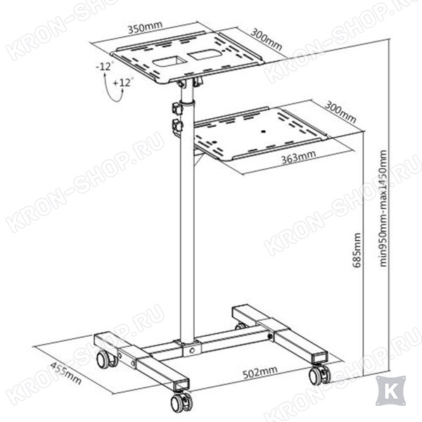 Столик оснащен полками с максимальным углом наклона 12 градусов, что позволяет выбрать и фиксировать положение полок с помощью удобной ручки в соответствии с местоположением экрана и типом полотна, поэтому направление луча проектора без проблем можно задать максимально точно на экран и тем самым обеспечить безупречное качество изображения. Соскальзывание проектора предотвращает ограждение полки и специальное покрытие против скольжения.